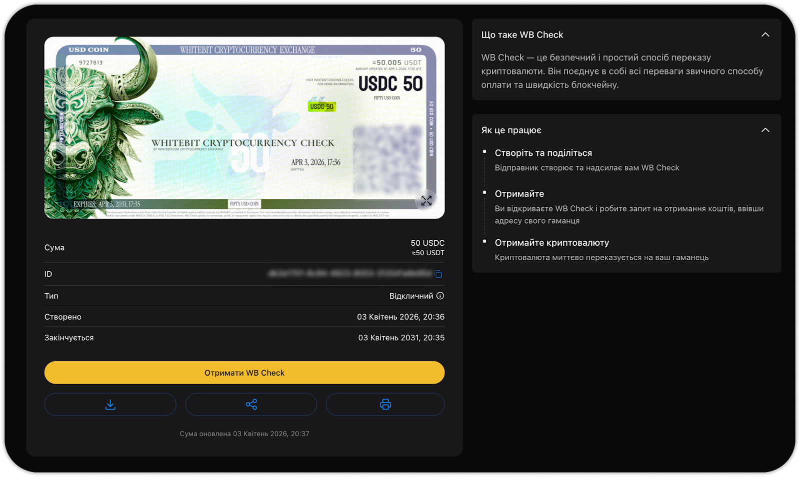 - WhiteBIT Check (можливість отримати кошти на баланс без необхідності попередньої реєстрації з боку одержувача).