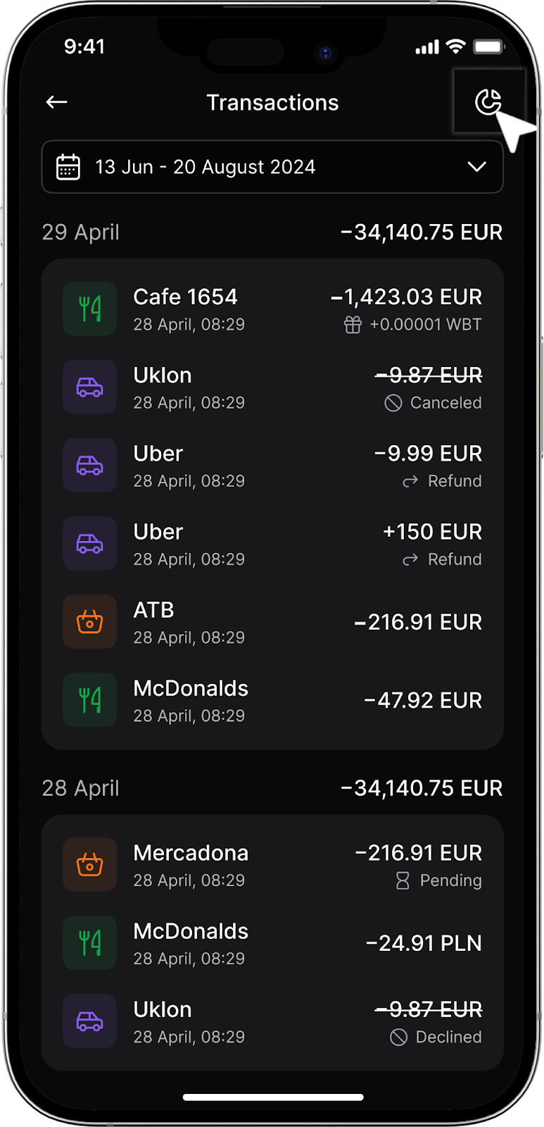 - У правому верхньому куті ви знайдете іконку діаграми. Натисніть на неї, щоб побачити всі витрати у відсотках, згруповані за обраним часовим діапазоном.