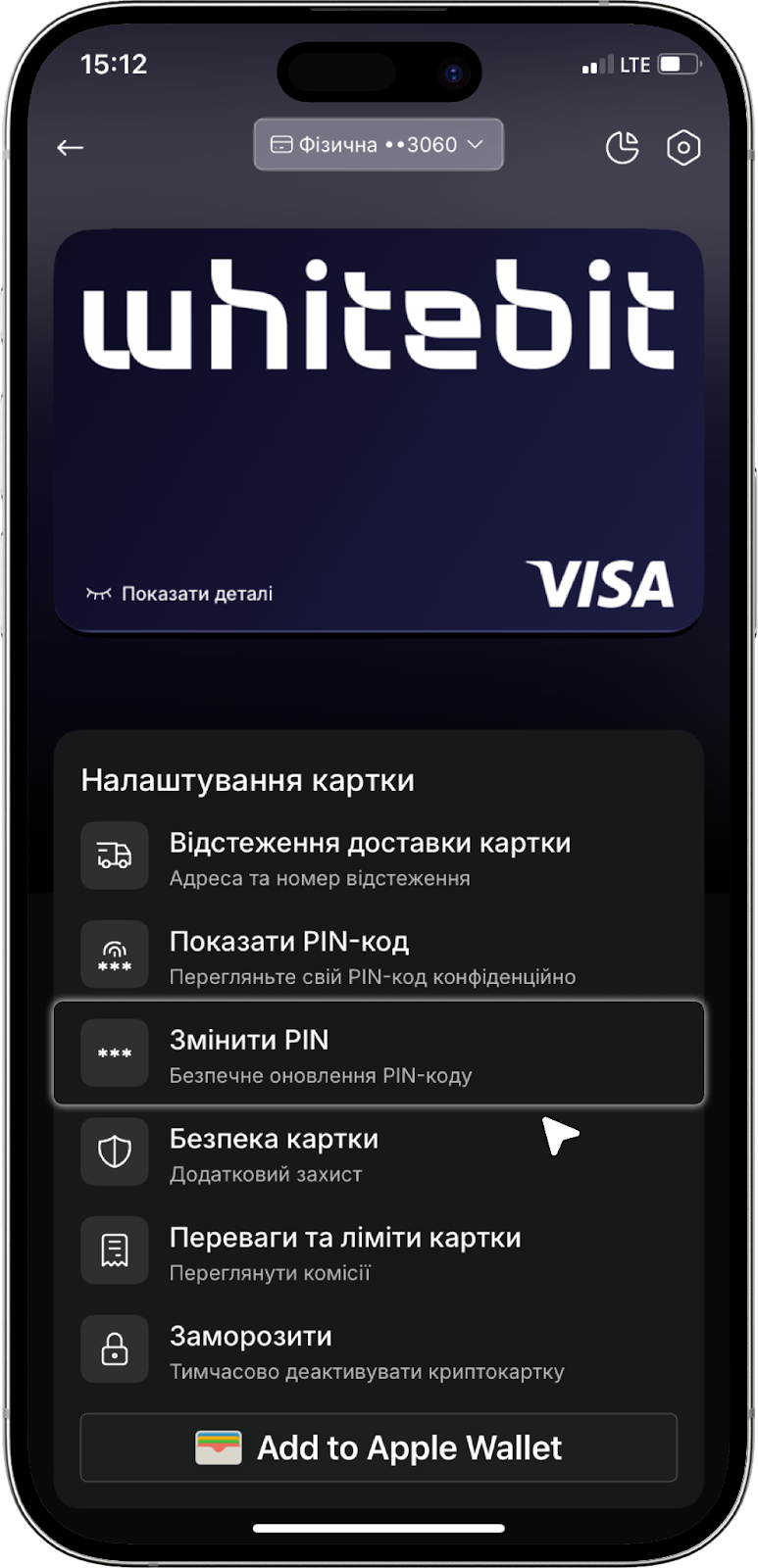 Зверніть увагу: Зміна PIN-коду доступна внизу під зображенням картки в розділі “Налаштування картки”. Необхідно натиснути “Змінити PIN”.