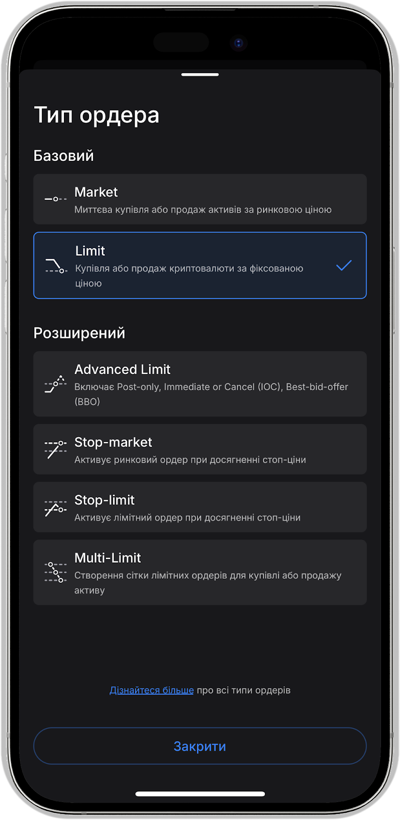 Розширені: Advanced Limit, Stop-market, Stop-limit, Multi-Limit, OCO.
